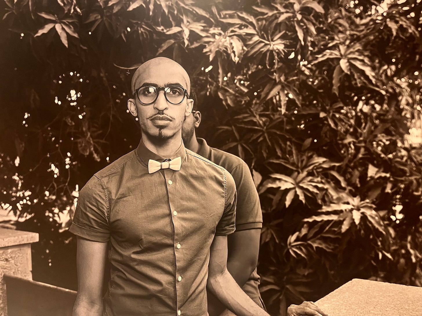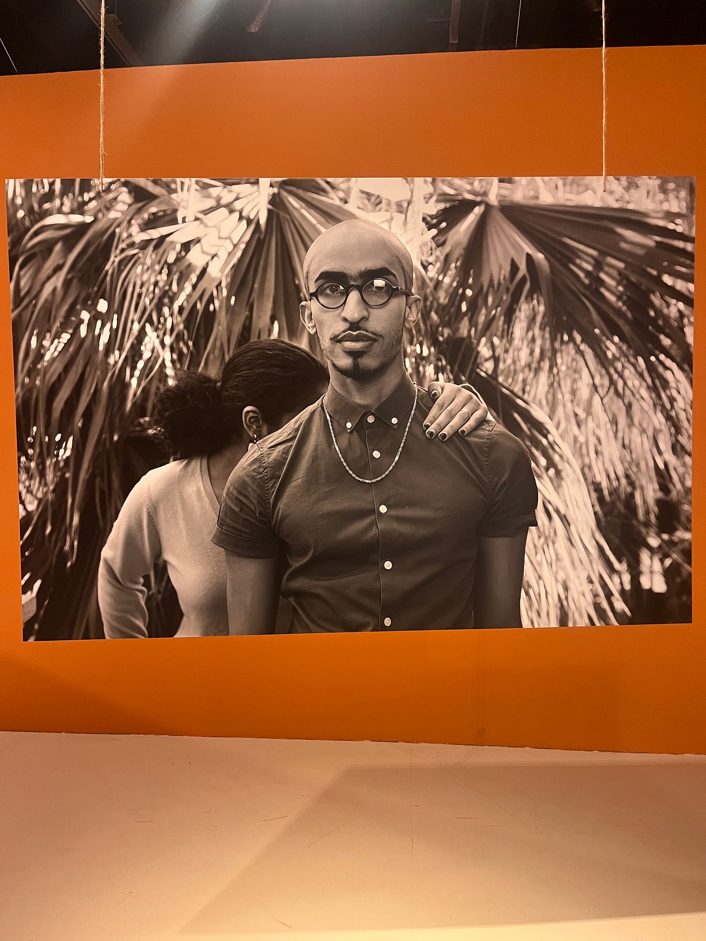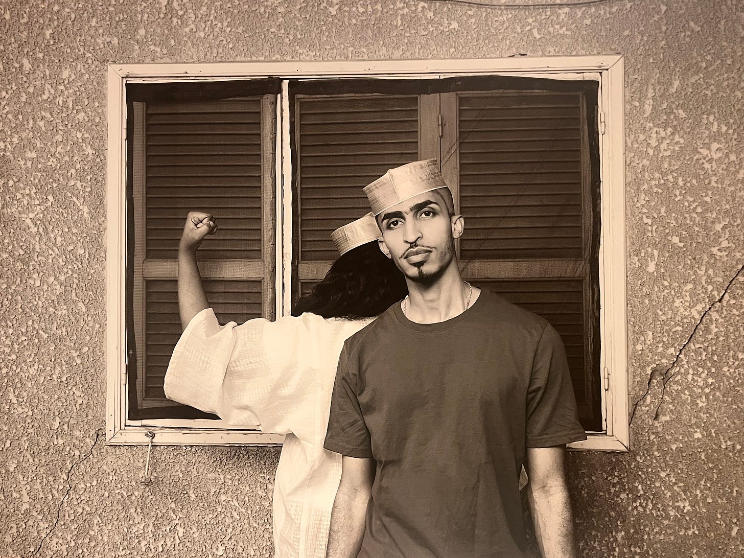 The second room had an exhibit, Carrying the Face of Ugliness—the photos you see throughout this newsletter, set in black-and-white, with Umar looking directly at the camera. Through the wall text, I learned that Umar was among the first people to come out in Sudan on social media in the 2010s. He faced threats and had to leave the country. But then he returned, and in this exhibit, he stands in front of others who haven’t been able to come out themselves.