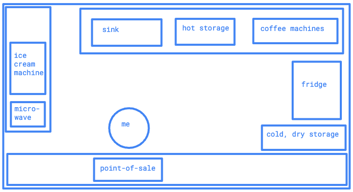 One of my jobs, at the dosa restaurant, is largely automated. I stand behind the front desk crowded and made cold by machines of all sorts, taking orders. I don’t really need to have the skills myself. Counting cash, taking tips, all of that is automated by the point-of-sale. Instead, my job, if I am to be really good at it, is that I distribute the intelligence of the machines. It’s kind of what LLMs are predicted to do across industries—code, writing—a sort of talking, chatting encyclopedia, where all of us sit at the fount of knowledge, pulling from it, running over it with our own individual style, and putting it out in the world. Anyway, my setup is pictured below.