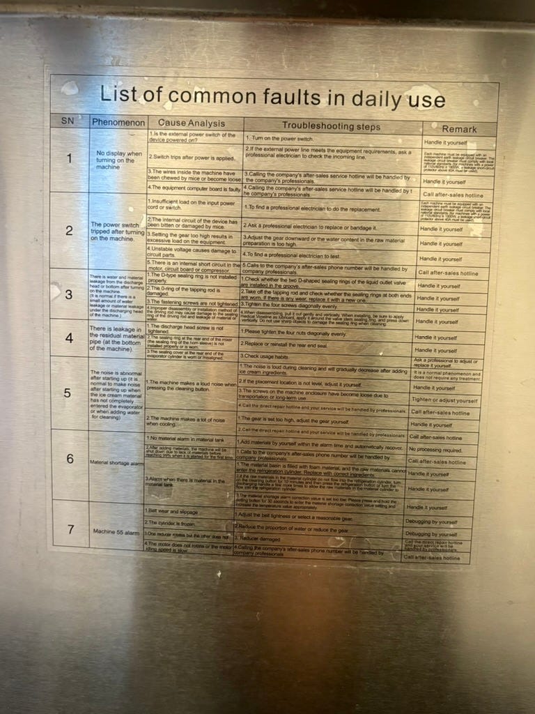 I take some mild relief in the fact that there are still dozens of old, lumbering machines in the kitchen. One looms behind me: the ice cream machine, an angry and complicated-looking device with several levers, a very small LED screen, and an entire sticker running down its front telling you exactly what will go wrong. And for most of the issues you might deal with—the power switch tripping off, no display when turning on the machine—the sticker tells you to “handle it yourself.” Don’t call them! They won’t pick up!
