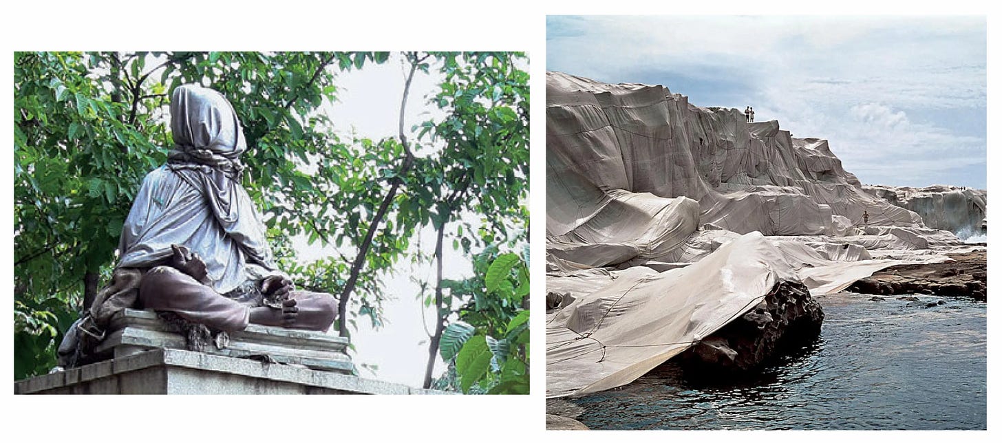 Left, covered statue in Bangalore mid-to-late 2010s. Right, Christo and Jeann-Claude’s “Wrapped Coast, One Million Square Feet,” 1968-69