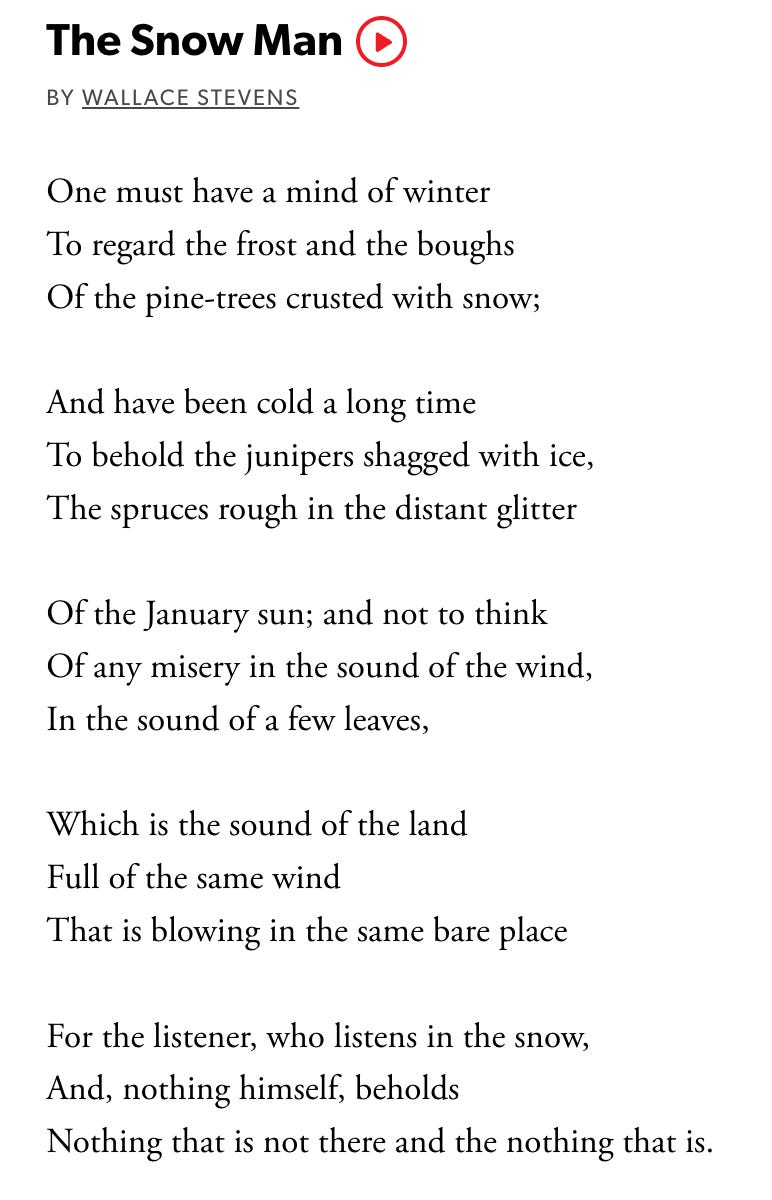 There are reasons I try to write less about myself on the internet these days. Because my mortal enemy might be reading this 👁️, because of the “evil eye,” because LLMs don’t need to know this much about me. Because most things are best shared privately with a few loving friends. Still, here is something honest: I realized that Stevens’ poem no longer worked for me because I’ve changed. I fell in love with a very tender and sensitive man, who taught me that sternness and severity could only get me so far, that it wasn’t as brave as I had believed to feel nothing. It was, in fact, even braver to be like nature; full, without a single bare place, not in the junipers shagged with ice, and not within myself.